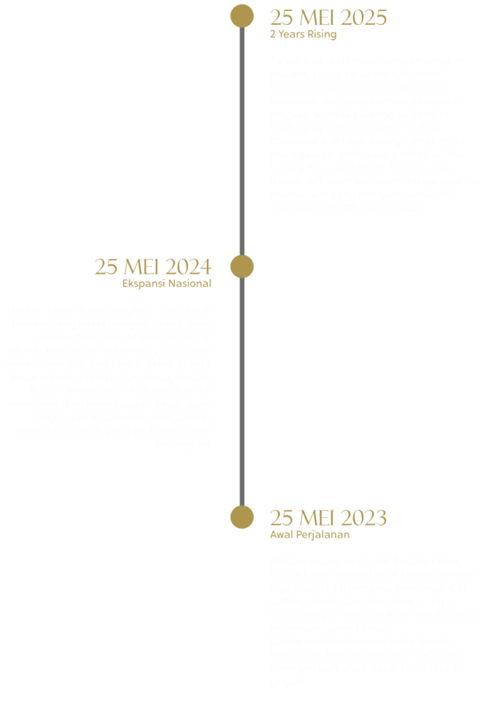 Luuca Indonesia bukan sekedar brand soft serve – kami adalah pelopor yang mempersembahkan italian-inspired soft serve dengan kualitas terbaik. Dirancang khusus untuk jiwa lokal yang penuh selera. Setiap sajian adalah harmoni rasa dengan tekstur, lembut seperti awan, kaya akan cita rasa, dan meninggalkan kesan mendalam di setiap suapan.
